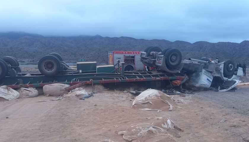 Aproximadamente a las 17:30 hs de la tarde de este jueves, se produjo un vuelco de un camión semi, marca Mercedes Benz, dominio HUC 711, perteneciente a la empresa Transporte E. García e Hijos que conducía un hombre de aproximadamente unos 40 años, a la altura del derivador transitando desde Calingasta por ruta 149 con destino hacia la Ciudad de San Juan. Aparentemente el conductor se habría quedado sin frenos en el descenso de ruta 149 llegando a ruta 412 a la altura del derivador, según autoridades de la Seccional 15ta de Ullúm. El hombre fue trasladado al Hospital Rawson. Participó además el Cuartel Central de Bomberos, a cargo del Oficial Ayudante Cristian Romero.