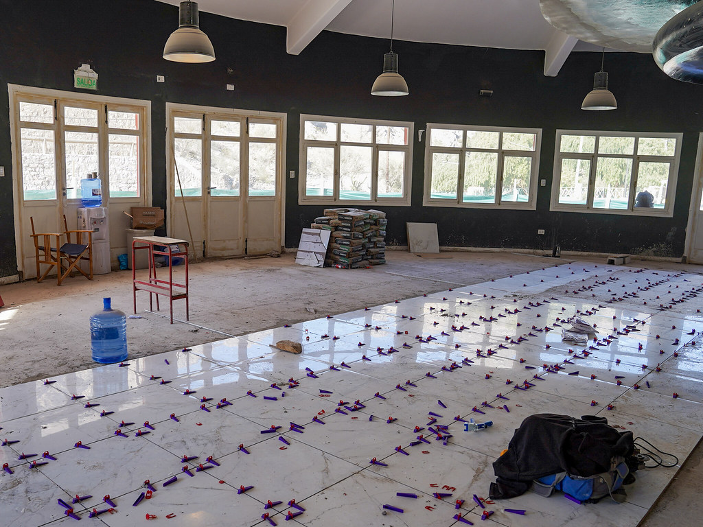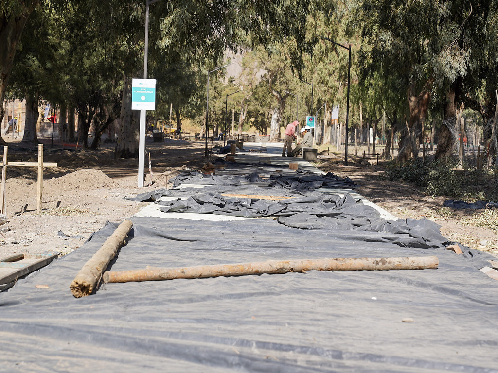 Los progresos más significativos se pueden observar en los espacios peatonales y el sistema sanitario completo. También se avanza con la mampostería de la confitería, el tendido de riego por goteo y la instalación de cisterna, entre otros.