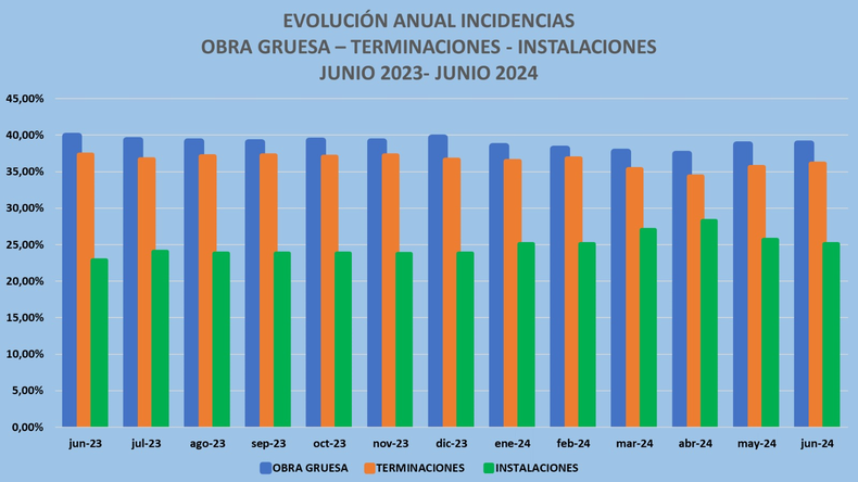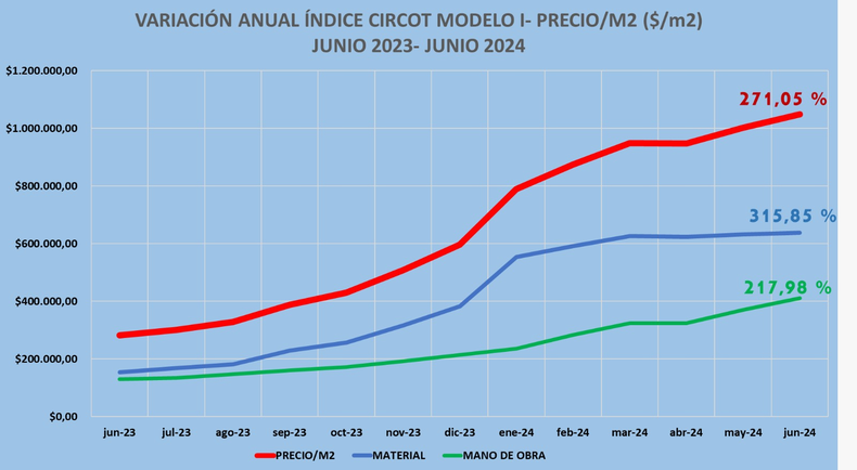 El incremento en el costo del metro cuadrado construido experimentó una suba del 4.68% respecto a mayo, impulsado principalmente por el costo de la mano de obra que aumentó 11%. Los materiales tambien se encarecieron, pero menos, un 0,63%. En el primer semestre del 2024 el costo del metro cuadrado acumula un incremento del 32,9%.