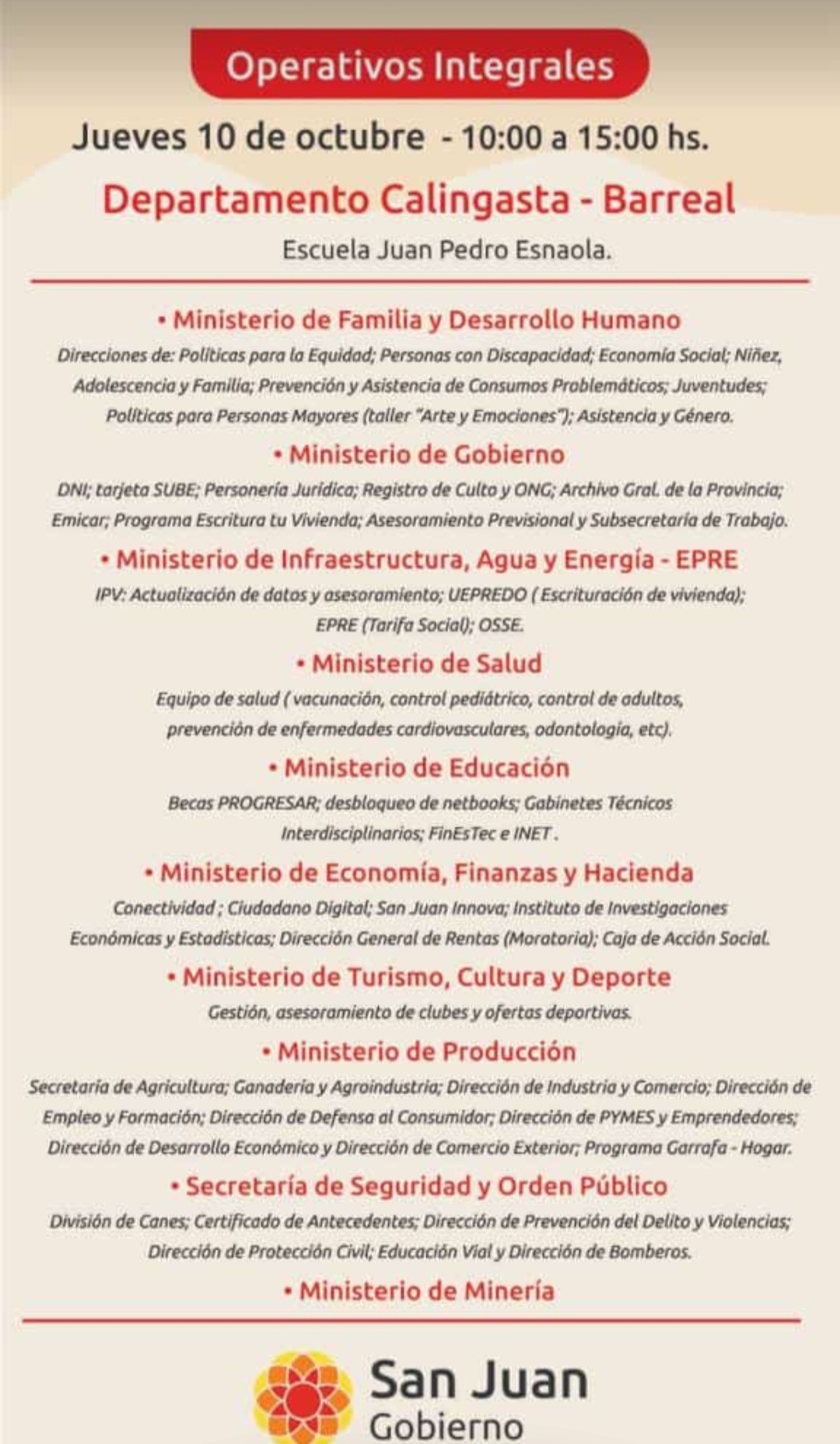 El Ministerio de Gobierno, una vez más, formará parte de los operativos integrales organizados por los distintos ministerios del gobierno de Marcelo Orrego. En esta ocasión, llevará sus servicios a los vecinos del departamento de Calingasta, específicamente en la localidad de Barreal. El operativo se desarrollará en la Escuela Juan Pedro Esnaola, de 10:00 a 15:00 horas.