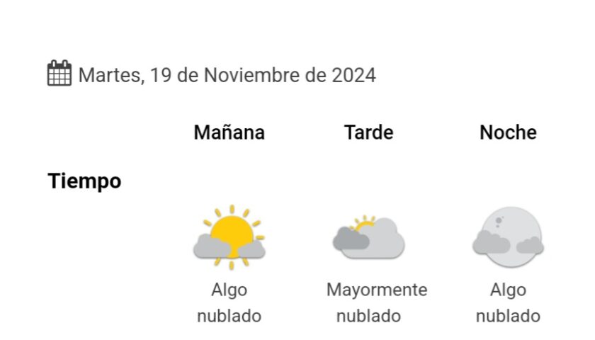 En un martes parecido al lunes por el fin de semana XL que se vivió en le país, el tiempo tendrá temperatura agradable en Calingasta. El Servicio Meteorológico Nacional anticipa un martes 19 de noviembre con una mínima de 12° y una máxima de 29°, con cielo parcialmente nublado, sin probabilidad de precipitaciones y llegada de viento del sector oeste a 22 km/h para la siesta. Según el organismo del clima, será una semana estable.