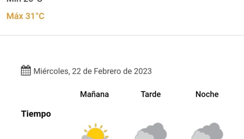 Para este miércoles habrá una temperatura mínima de 20° y máxima de 31°, con 40% de chances de caída de lluvias aisladas.
