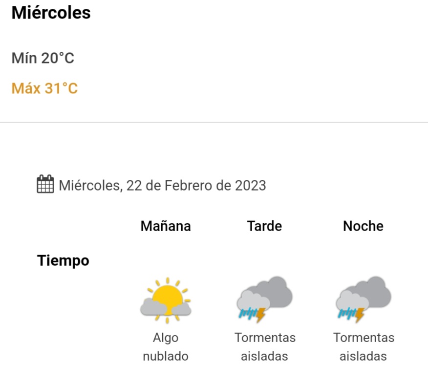 Para este miércoles habrá una temperatura mínima de 20° y máxima de 31°, con 40% de chances de caída de lluvias aisladas.