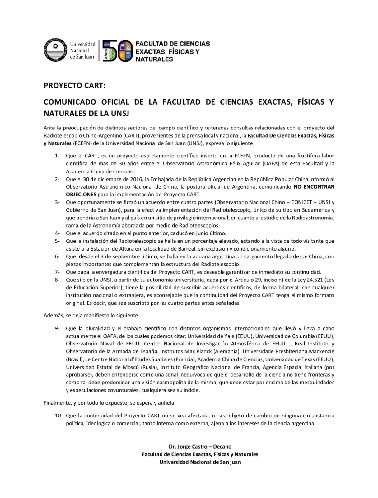 Ante la preocupación de distintos sectores del campo científico y reiteradas consultas relacionadas con el proyecto del Radiotelescopio Chino-Argentino (CART), provenientes de la prensa local y nacional, la Facultad De Ciencias Exactas, Físicas y Naturales (FCEFN) de la Universidad Nacional de San Juan (UNSJ), expresó lo siguiente: