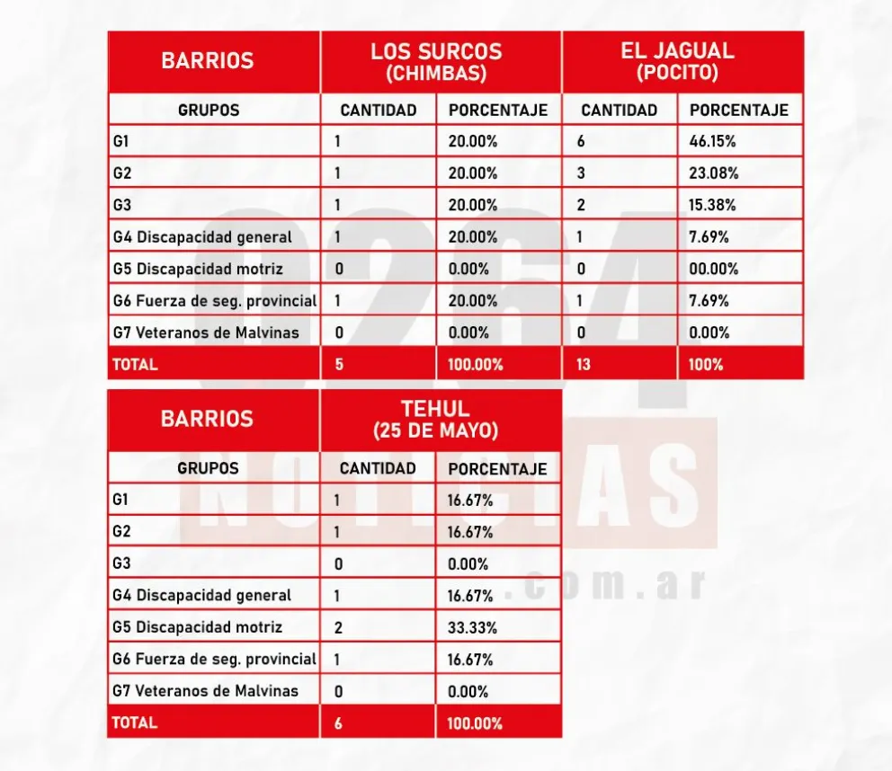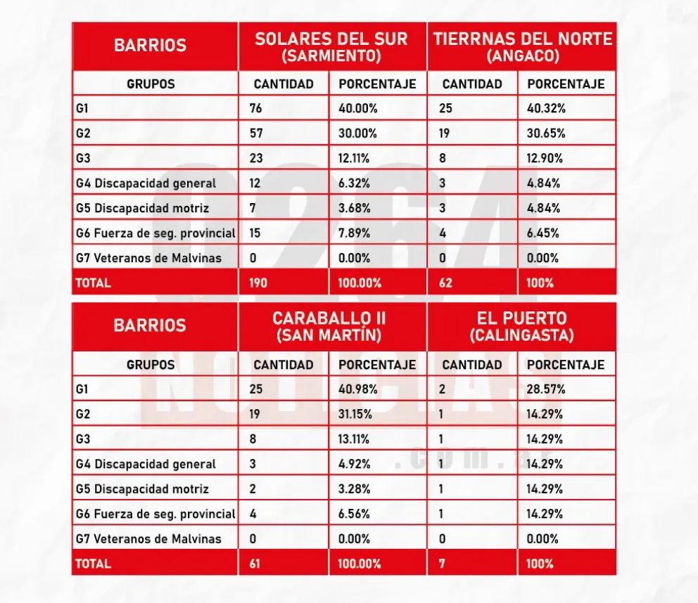 Sobre los grupos, para los interesados es clave conocer cómo será la distribución, ya que, de esa manera, pueden analizar con cuántas chances podrán contar. Por ejemplo, en el caso del barrio Solares del Sur, de Sarmiento, aquellos con más antigüedad en el IPV dispondrán de 76 casas.
